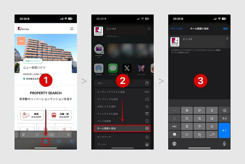 iOSでサイトをホーム画面に追加する方法 ブラウザのツールバーにある「共有アイコン」をタップ 展開されるメニューから「ホーム画面に追加」をタップ 名称を入力して、「完了」をタップ の3ステップでホーム画面に追加できます。